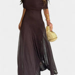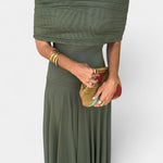 Изкуствена силует, който съчетава модерност и женственост. Рената се отличава с деколте с едно рамо, което с изящество обрамчва ключицата, а също така идва с летяща макси пола, която носи елегантно движение. Нейният тай-драй десен в топли и нежни тонове създава хипнотичен ефект, пълен с характер.