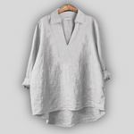 Елегантна ленена блуза, която излъчва минималистична елегантност и вечен стил. Дълбокото V-образно деколте с елегантна яка придава модерен силует, докато свободният крой осигурява комфорт и лекота на движението. Асиметричният завършек с по-дълга задна част допълва елегантната естетика.