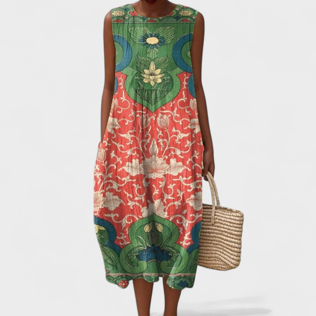 Тази лека и въздушна рокля перфектно съчетава стил и практичност, предоставяйки ви свобода на движение и изискан вид за всички поводи. Нейният свободен крой и цветен десен я правят идеален избор за плажа, разходка в града или летни срещи.