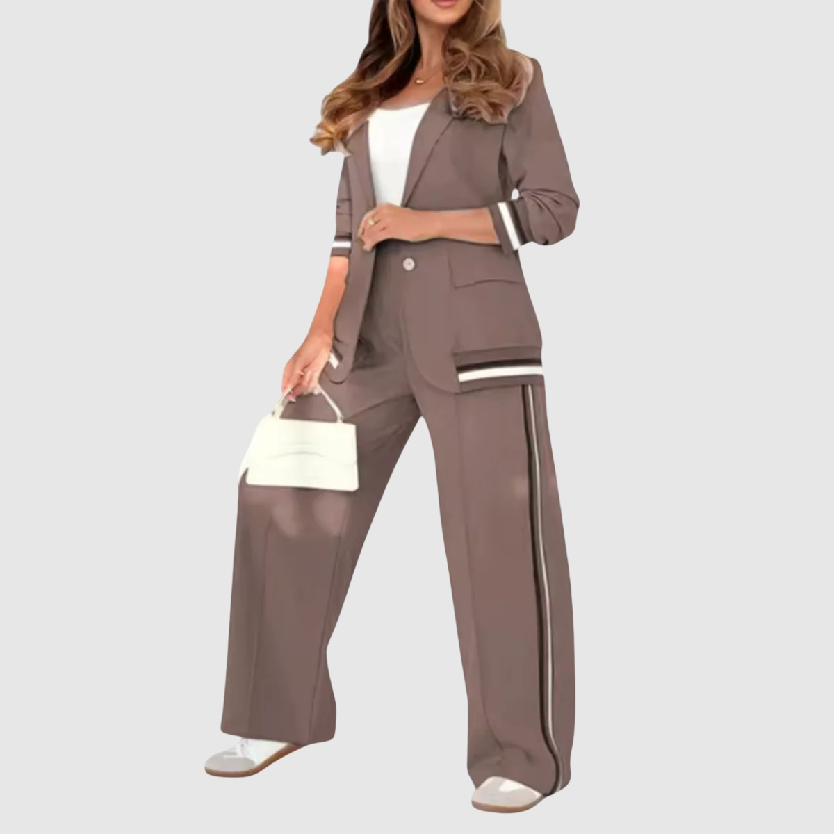 Този комплект е създаден за модерни жени, които искат да съчетаят комфорт и стил без усилие. Със свободна кройка и контрастни детайли, той е перфектният избор както за ежедневието, така и за специални поводи. Сакото с изчистена линия и широкият панталон създават силует, който излъчва увереност и модерност.