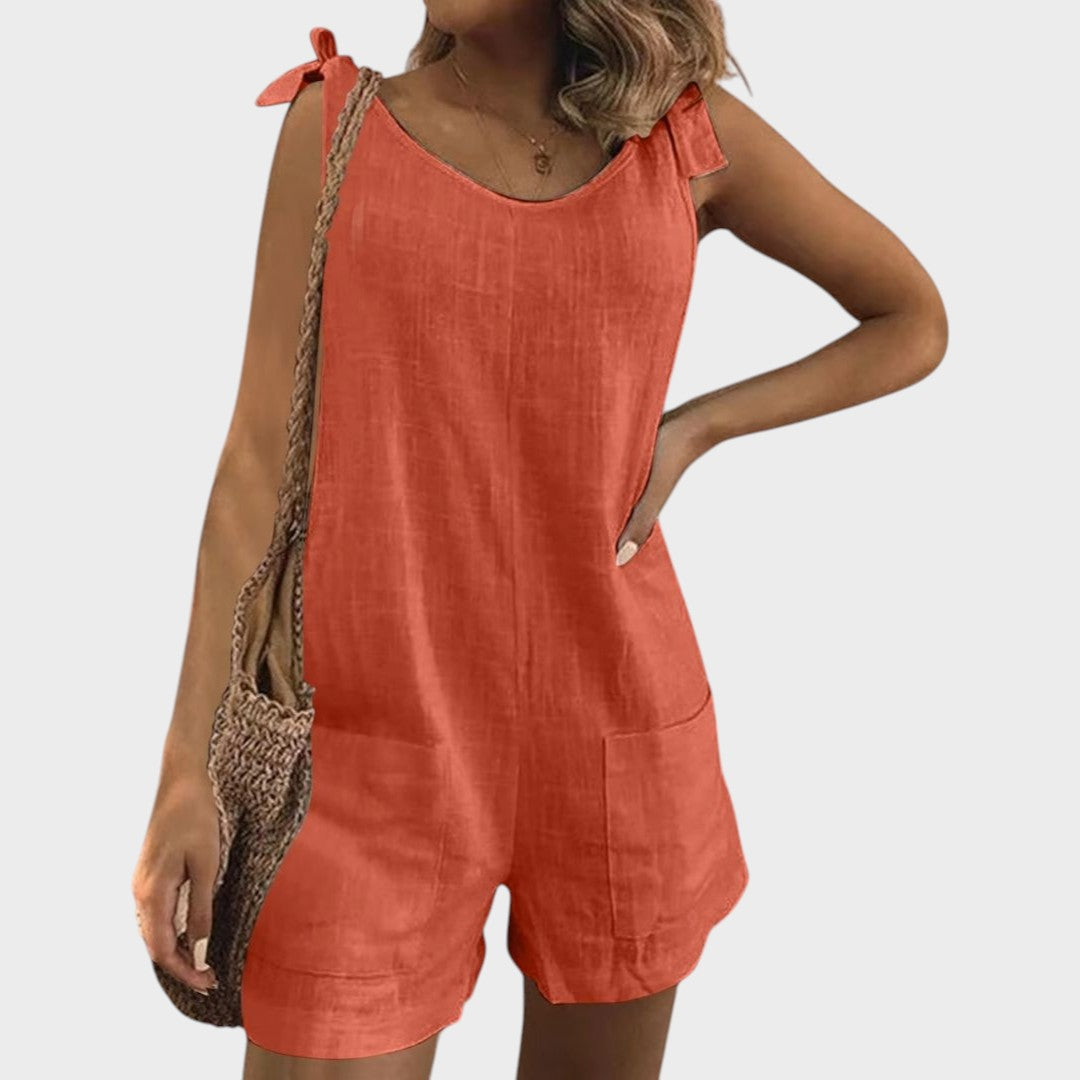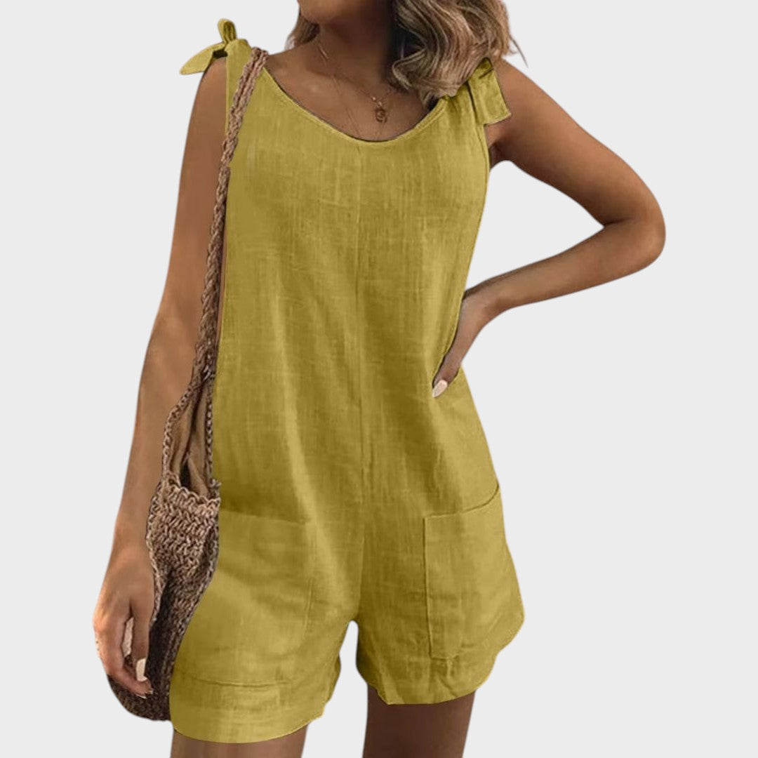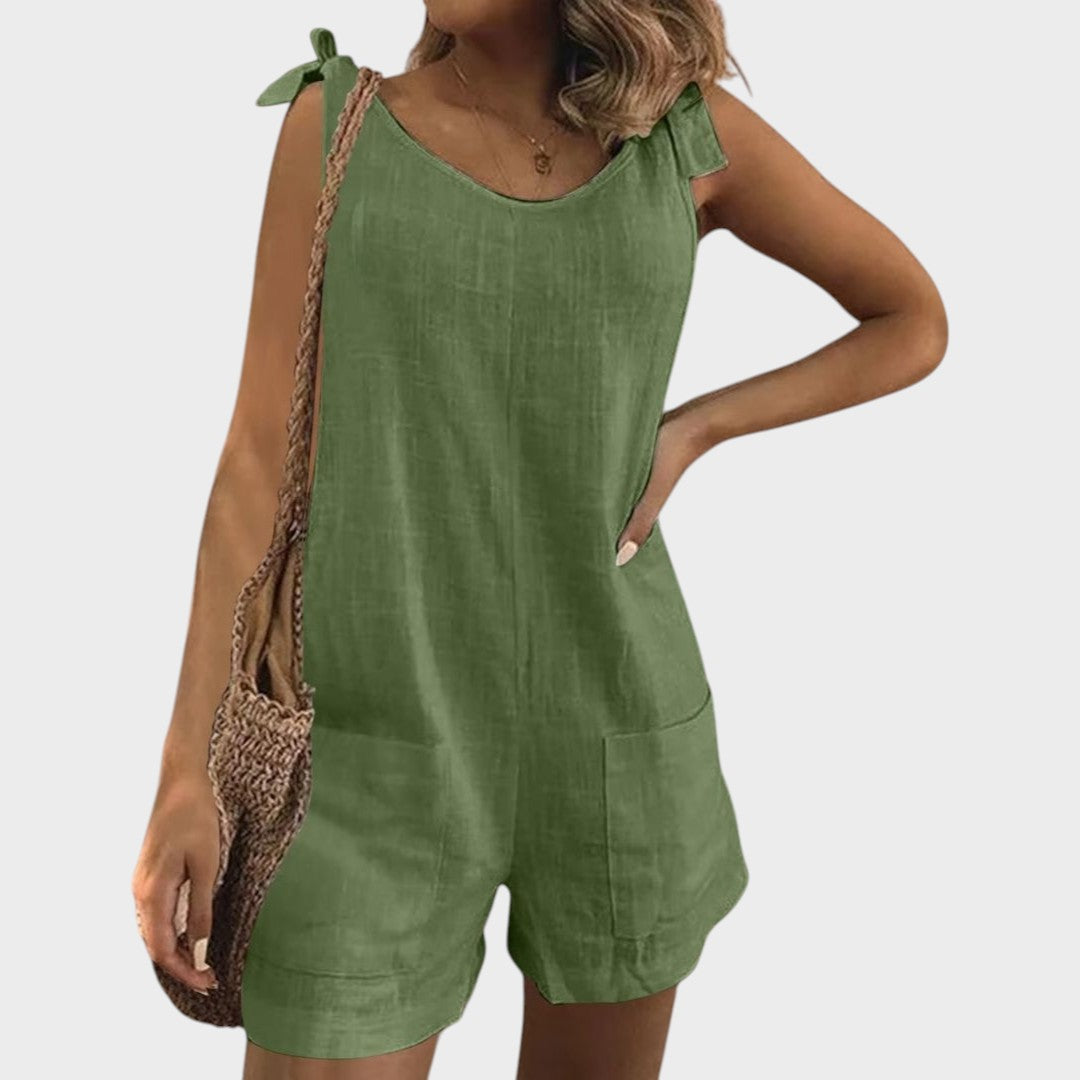 Този лек комбинезон е перфектен избор за топлите дни и неформални поводи. С модерен безръкавен крой, практични джобове и женствени връзки на раменете, той предлага комбинация от комфорт и стил, която ще ви придружава от сутрин до вечер.