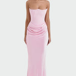 Импозантна и сексуална рокля с корсет без презрамки и тесен крой, който подчертава силуета. Детайлът с елегантен набръчкан колан придава женственост и уникален флуид, докато макси дължината осигурява вечна елегантност. Идеална за тържествени вечери и блестящи изяви.
