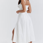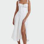 Лятна рокля с бюстие, която комбинира женственост и комфорт. Персонализираната кройка в горната част подчертава деколтето, докато летящата пола осигурява движение и свежест. Идеална за летни разходки, ваканции и елегантни ежедневни излизания.