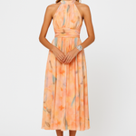 Елегантна и лека рокля с впечатляващо връзване около врата и романтична атмосфера. Коланът в талията подчертава силуета, докато въздушната пола с набрани детайли носи движение и изисканост. Идеална за сватби, летни събития или вечери, изпълнени със стил.
