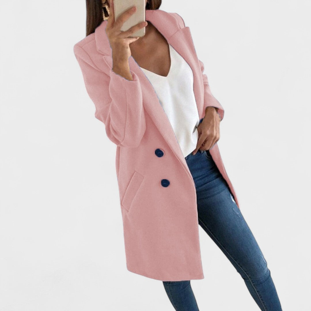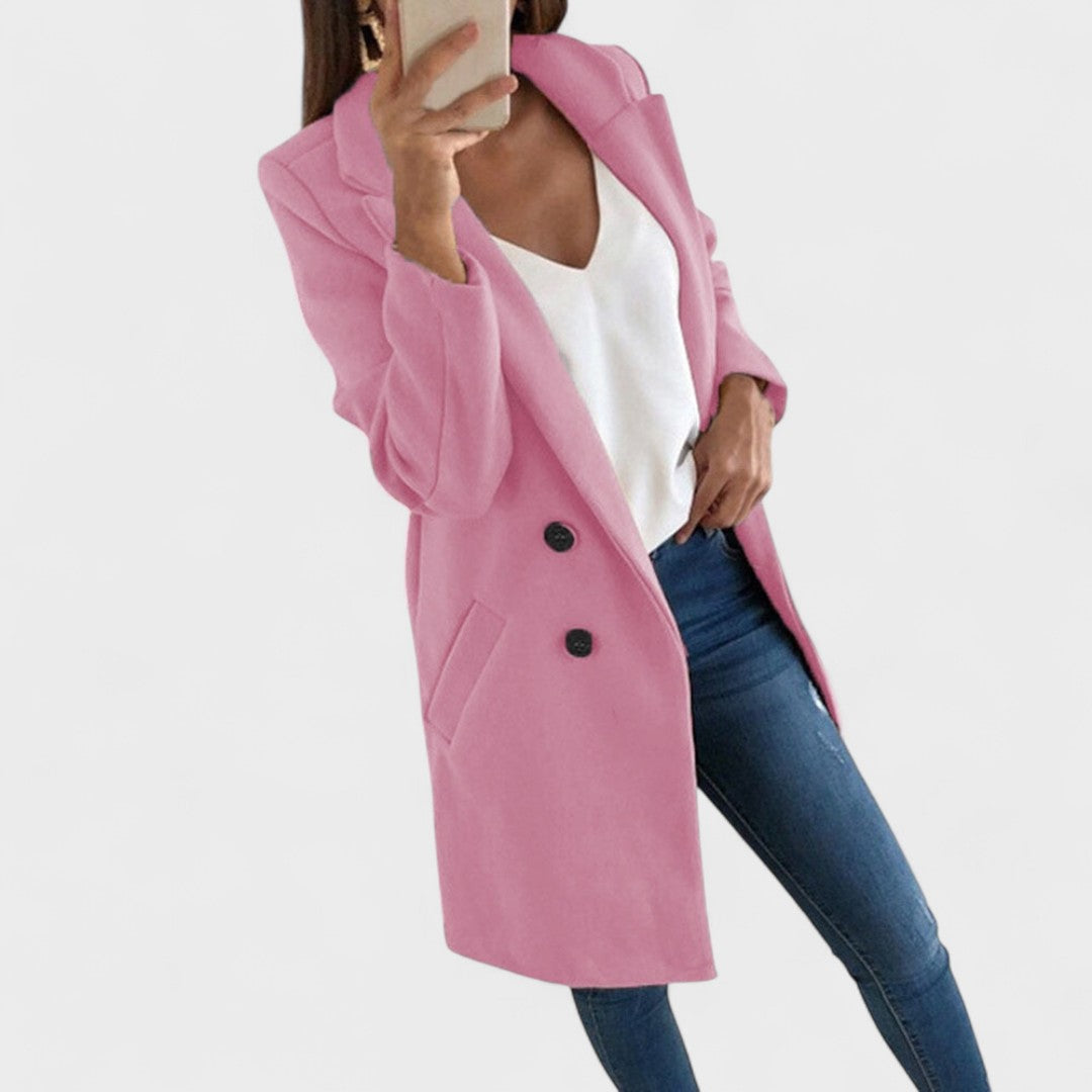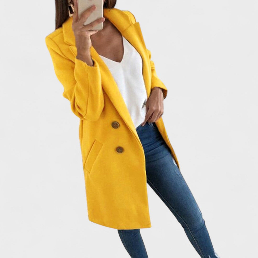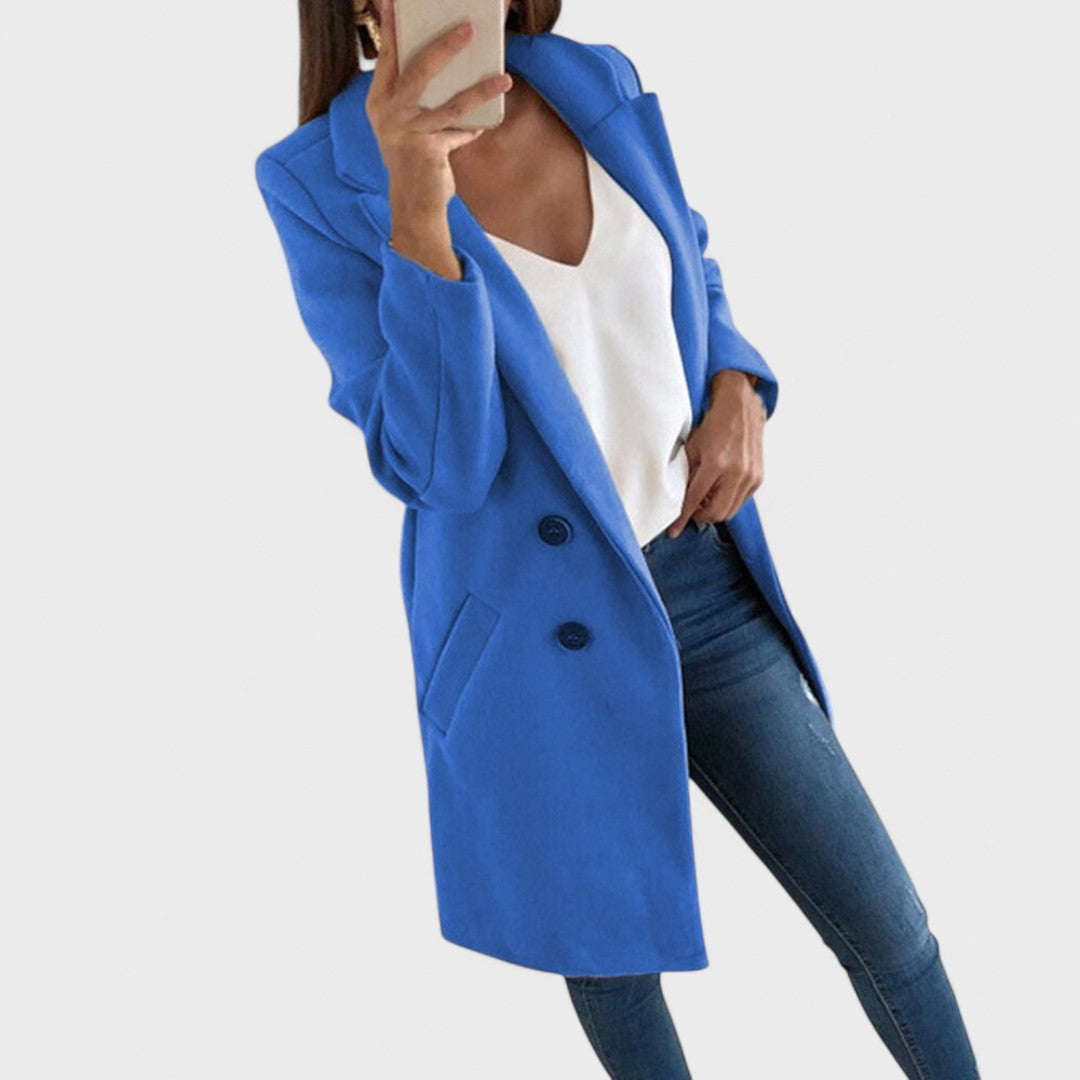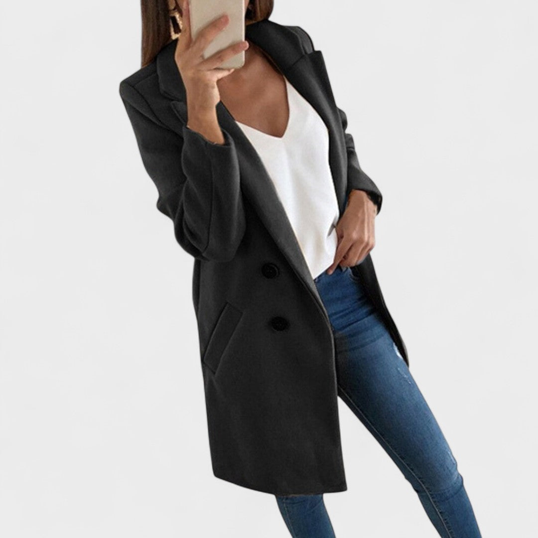 Изгоден крой – чисти линии, ревери и дължина, която визуално удължава фигурата.