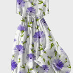 Тази елегантна макси рокля с бяла основа и лилави цветя излъчва свежест и женственост. Леката материя и проветливият крой я правят идеална за вашите пролетни и летни визии.