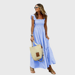 Внесете дъх на свежест и игривост в летния си гардероб с тази прекрасна макси рокля в синьо-бяло каре. Смок горната част идеално приляга и подчертава талията, докато леката и въздушна материя осигурява максимален комфорт в горещите дни. Роклята лесно се комбинира с сандали, шапка или плетена чанта за перфектен casual-chic вид.