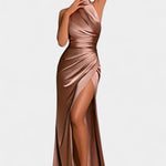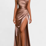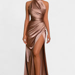 Модерна и изискана, роклята Катарина се откроява със своя скулптурен дизайн и течна елегантност. С халтер изрез, който е усукан, дефиниран талия и дълга пола със страничен разрез, предлага впечатляваща силуета с обгръщащо движение, което привлича всички погледи.