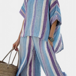 Живописна свежест с цветова нежност. Комплект Daisy комбинира флуидна блуза и панталони с широки крачоли и вертикални райета, вдъхновени от Средиземно море. Нежните нюанси и леката текстура създават весела, удобна и динамична визия.