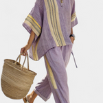 Релаксираща елегантност с артистичен щрих. Комплект Daisy в мека лавандула с горчица детайли комбинира естествена свежест с бохо дизайн, идеален за разходки по морето или летни следобедни излизания с удобен стил.