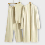 Този комплект от ребриста тъкан носи чист и модерен вид за по-хладните дни. Състои се от панталони с прав силует, безръкавна блуза с висок яка и дълго палто без копчета, предлагаща елегантност и комфорт в едно. Идеално за универсални комбинации, от домашния офис до по-неформални задължения с много чар.