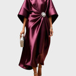 Излъчваща лукс и вечна елегантност, тази сатенена рокля е епитом на финеса. Нейният уникален крой в комбинация с декоративната катарама подчертава силуета с дискретен блясък.
